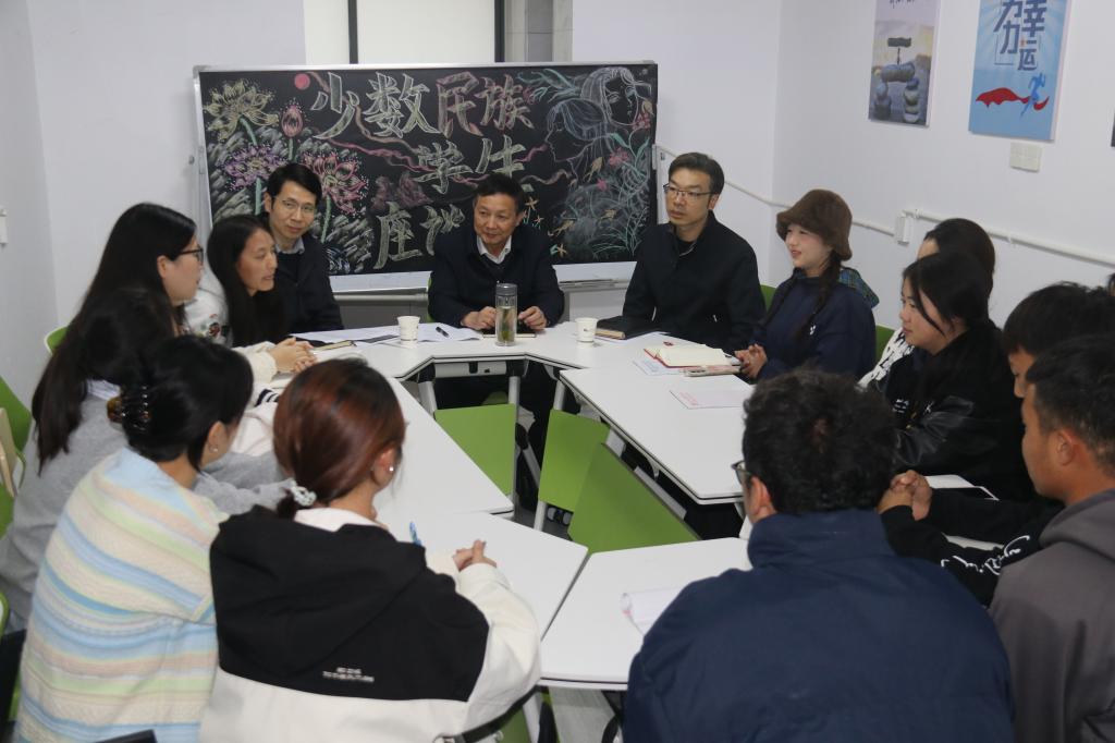 调研首站来到社区党团活动室,一场围绕民族大融合的座谈会在此温情举行。张凤成与少数民族学生代表面对面交流,认真倾听大家的心声与诉求。土家族学生牟慧敏分享了三年大学时光的成长感悟,她鼓励学弟学妹们在深耕专业学习的同时,积极参与各类文体活动,在实践中拓宽视野、锤炼本领。藏族学生生格东周对学校食堂的丰富菜品和优质服务赞不绝口,作为体育爱好者,他提议学校多组织篮球、足球、羽毛球等青年喜闻乐见的体育赛事,进一步浓厚校园运动氛围。壮族学生李洪姗谈及社区宿管阿姨时满脸暖意,“阿姨们总是和蔼可亲,不管是生活琐事还是突发问题,都会笑着耐心帮忙解决,让我们在异乡感受到了家的温暖”。黎族学生黄燕丽则反映了外卖错拿的困扰,“社区门口偶尔会出现外卖误拿的情况,部分区域监控设备损坏,导致丢失后难以找回”。针对这一问题,张凤成立即联系保卫处相关负责人,明确要求限期完善监控设施,切实保障学生财产安全。
