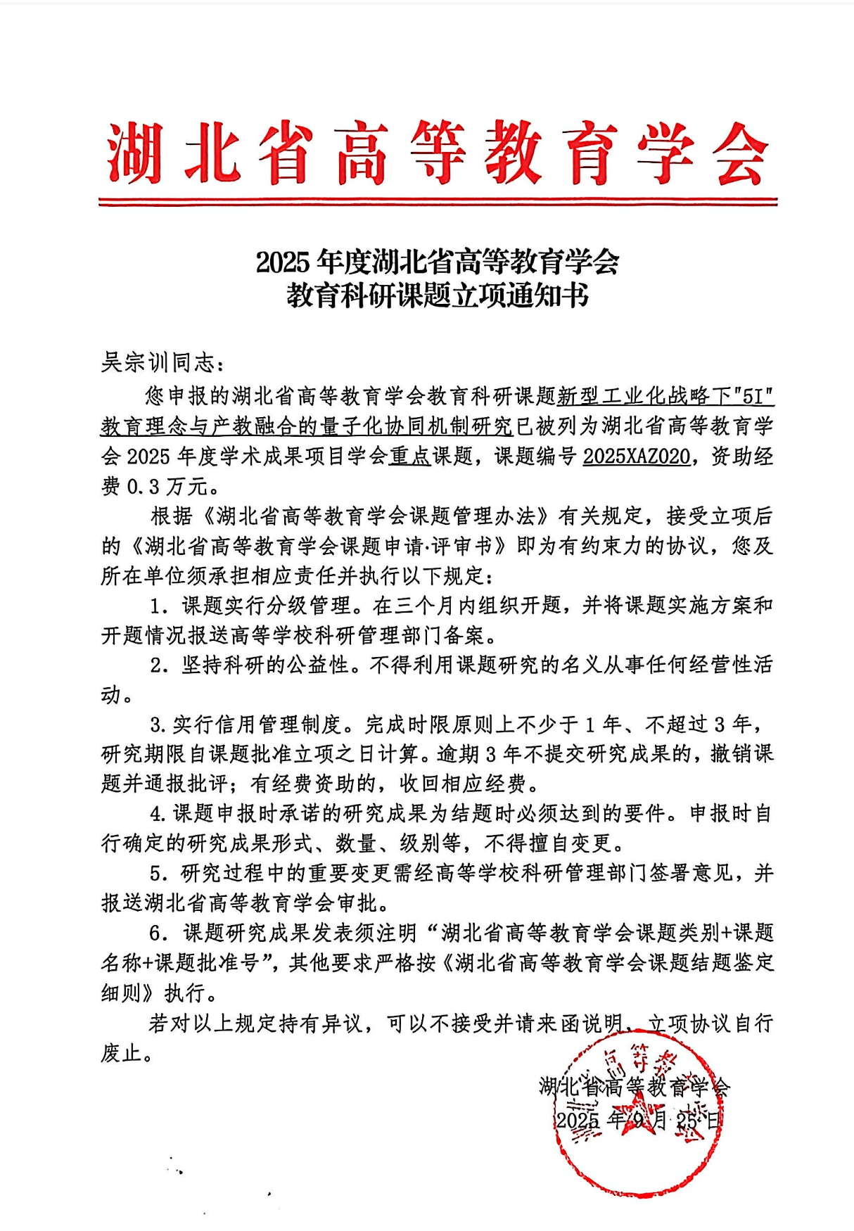 近日,湖北省高等教育学会正式发布 2025 年度教育科研课题立项通知,随州职业技术学院文化旅游产业学院吴宗训博士主持的《新型工业化战略下 "5I" 教育理念与产教融合的量子化协同机制研究》成功获批学会重点课题(课题编号 2025XAZ020),资助经费 0.3 万元。这一立项标志着学校在职业教育产教融合理论创新领域取得重要突破。